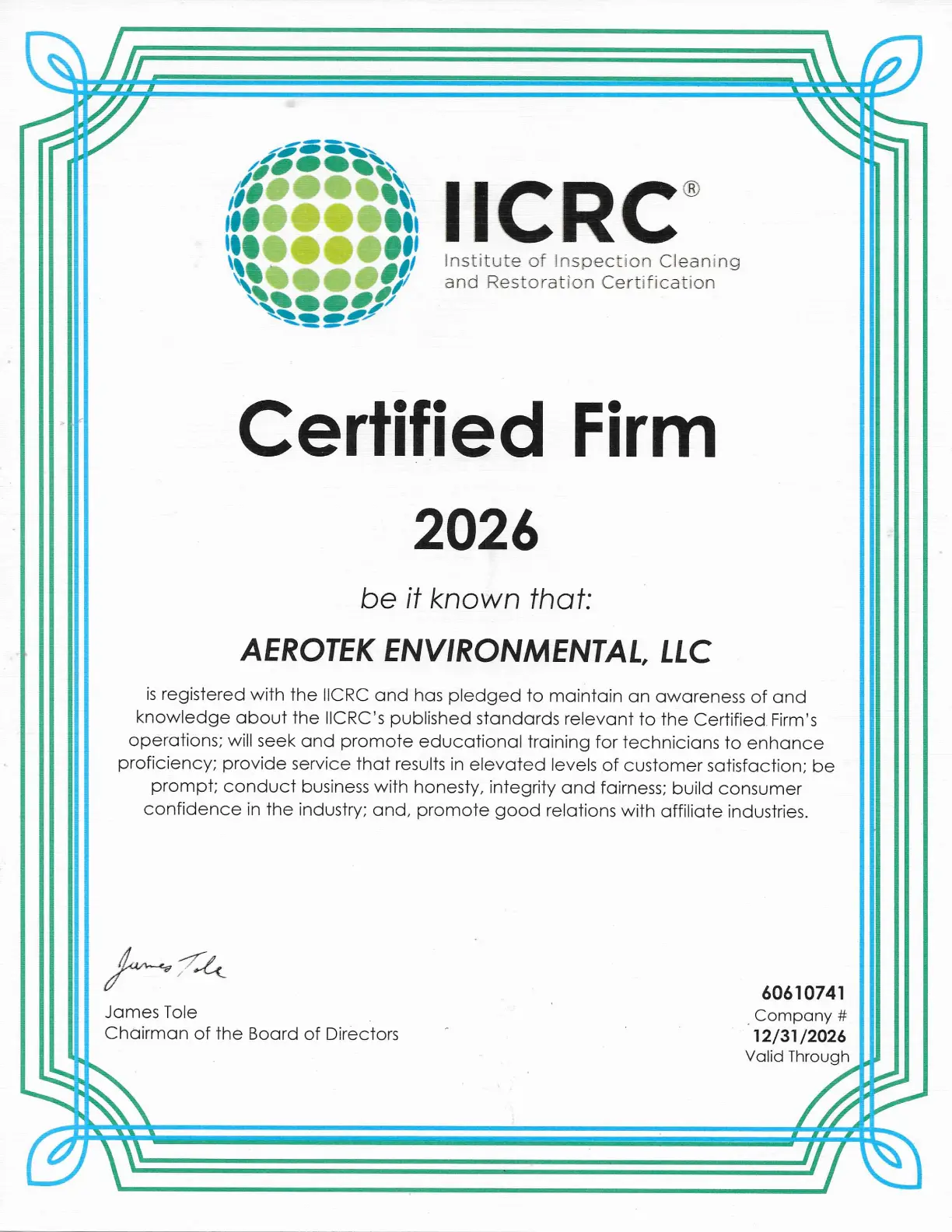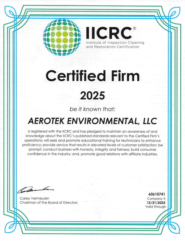 IICRC certification confirms that Aerotek Environmental follows the industry’s highest standards for mold remediation, water damage restoration, and environmental cleanup. This credential ensures proper containment, proven remediation protocols, and documented procedures that meet insurance and industry compliance requirements — never shortcuts.