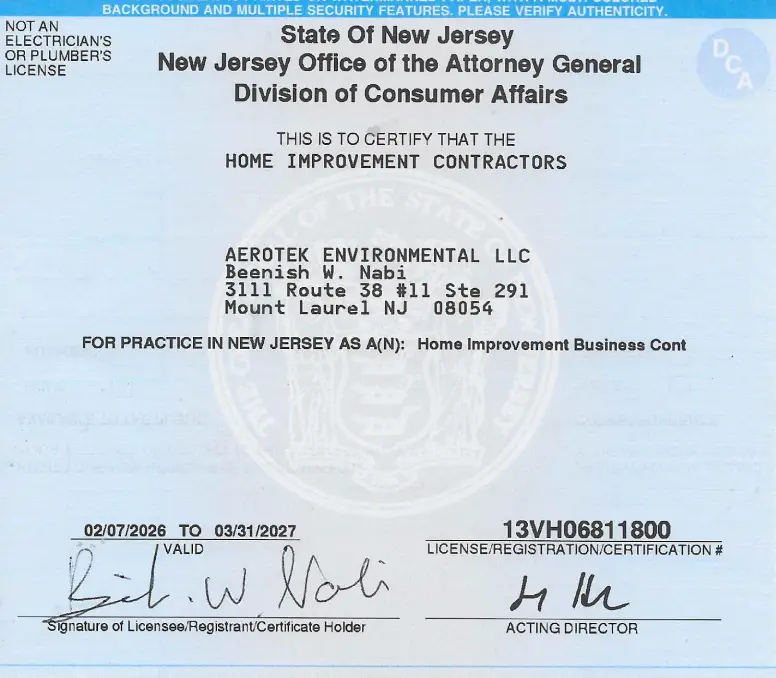Hiring a licensed contractor protects you from poor workmanship, code violations, and unnecessary liability. Aerotek Environmental LLC holds verified state licenses in New Jersey and Pennsylvania and is registered with the New Jersey Department of Health for mold remediation and environmental consulting. Licensing ensures all work is performed to regulated standards, follows proper safety protocols, and is documented correctly for real estate, insurance, and legal purposes.